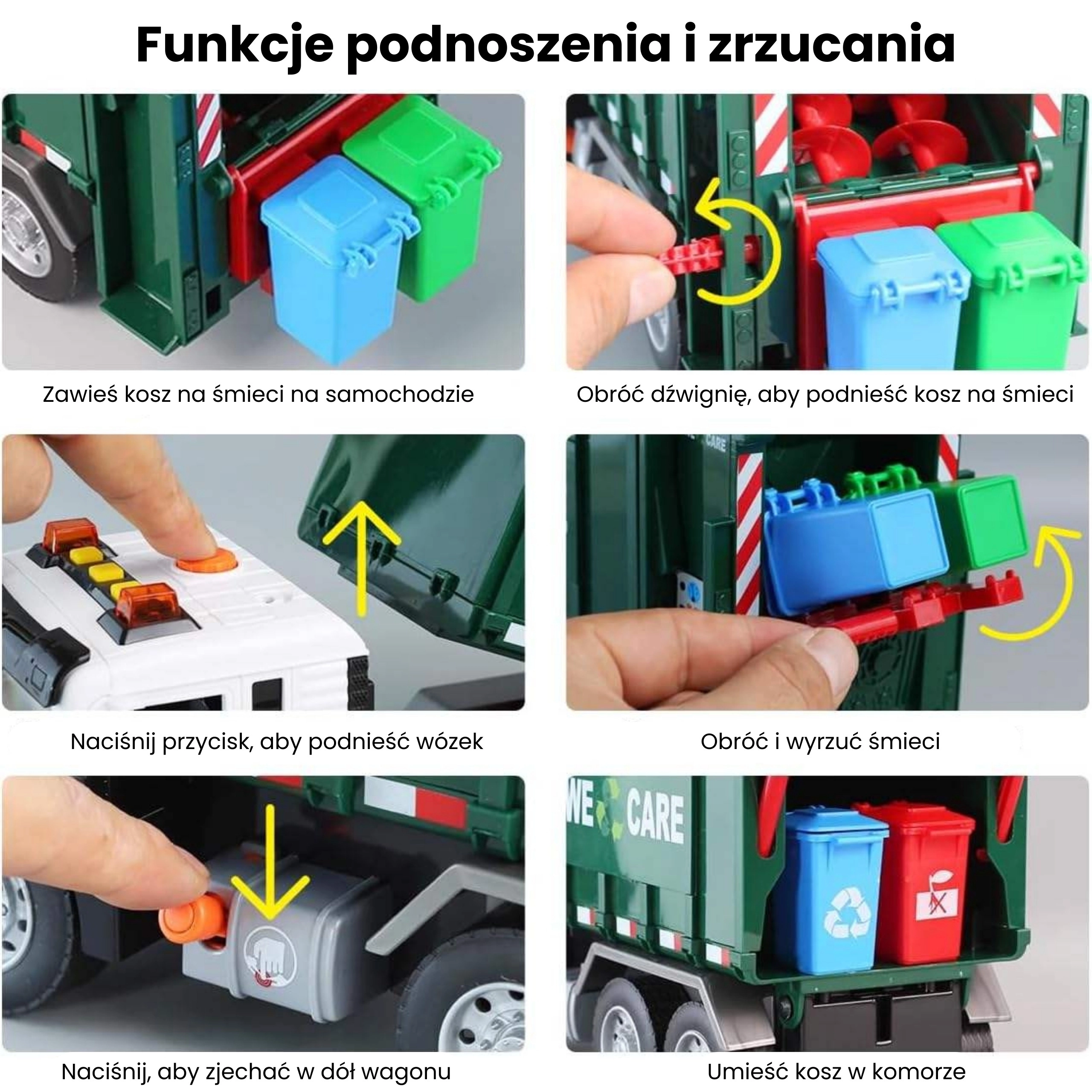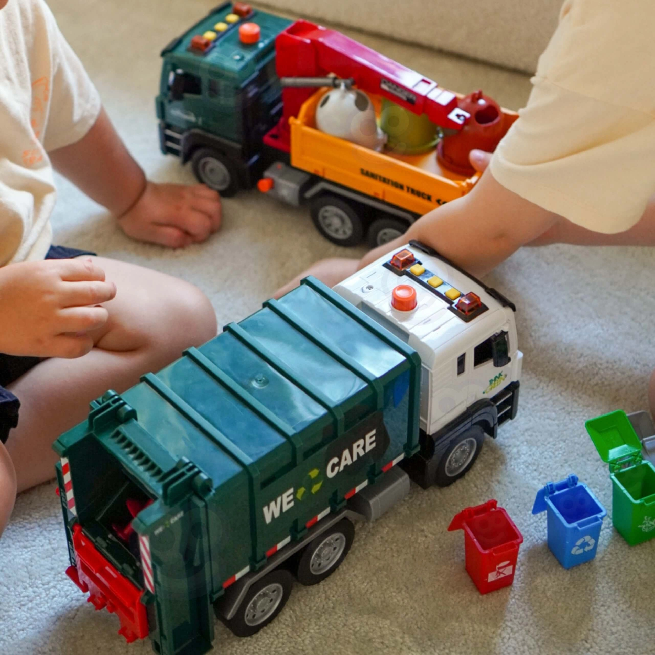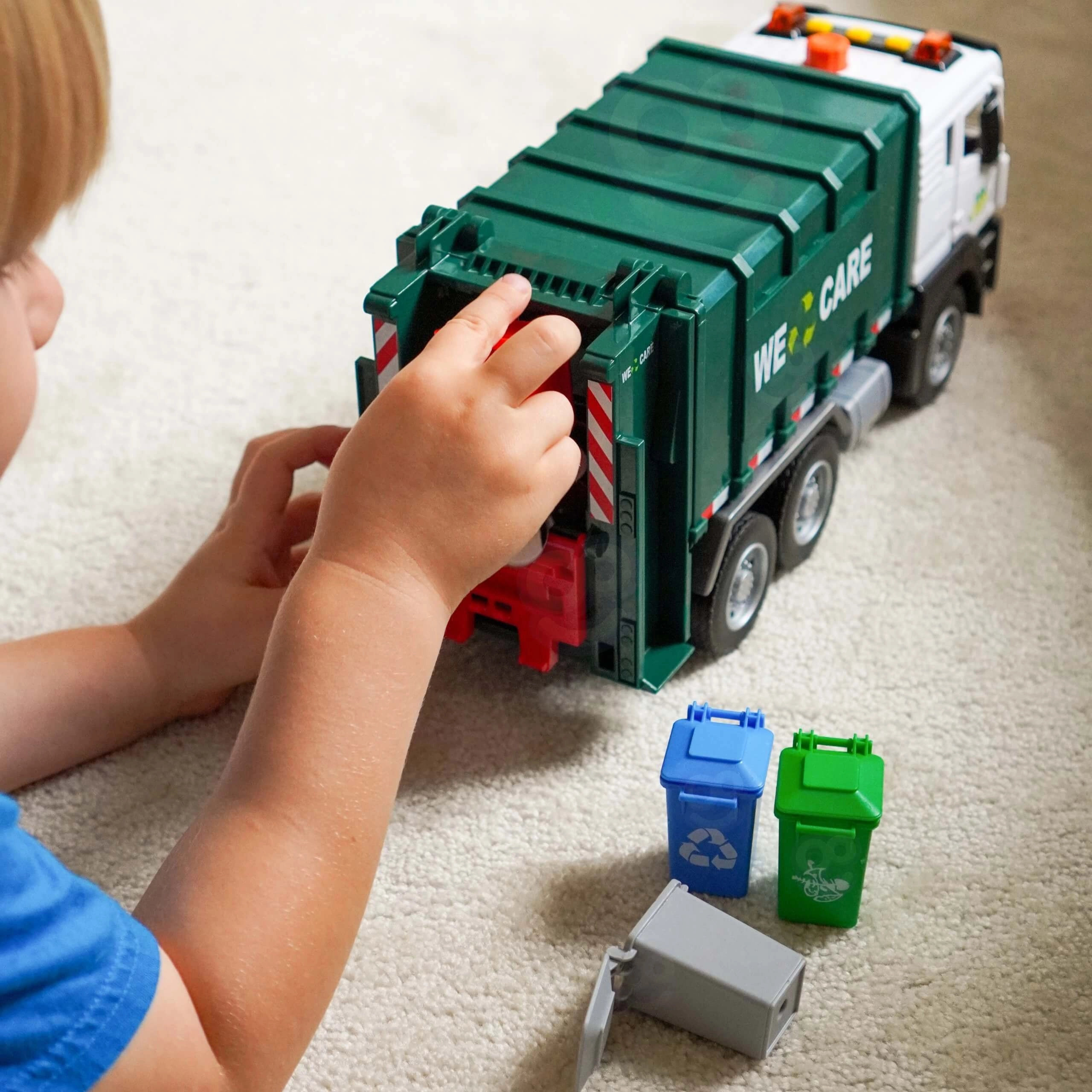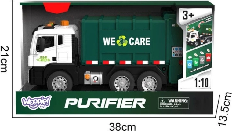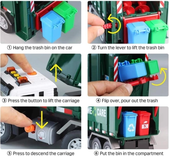 Ta podrobno izdelan smetarski tovornjak z napisom »WE CARE« otrokom ponuja pristno igro odvoza odpadkov. Zahvaljujoč funkcionalni dvižni roki, odpirajočim se zadnjim vratom in priloženim mini košem si otroci preizkusijo resnične postopke ločevanja in odvažanja odpadkov. Vgrajeni svetlobni in zvočni učinki povečujejo zabavnost in spodbujajo domišljijo.