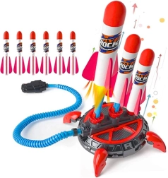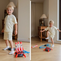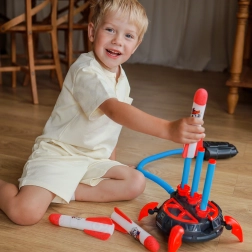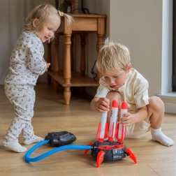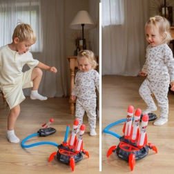 Ta večtarčna penasta raketna strelnica prinaša otrokom od 6 let veliko gibanja, veselja in raziskovanja. Dovolj je, da stopiš na pumpo, in rakete iz mehke pene se varno poženejo navzgor. Stabilna osnova sprejme več raket hkrati in omogoča enostavno ter hitro izstreljevanje.