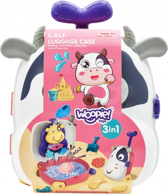 Prisrčen kovček v obliki kravice znamke WOOPIE združuje kar tri zabave v enem: prenosni kovček, komplet za pesek in vodno igro. Dovolj je, da spodnji del napolnite z vodo, vodo nalijete v zgornji del in opazujete, kako preteka in se steka – odlično za razvoj čutov in zbranosti. Idealno za plažo, pesek in na potovanja.