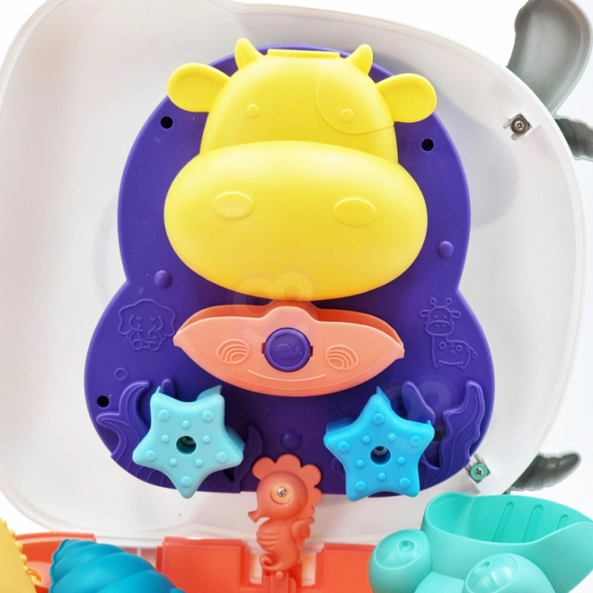 Ko kovček položite »na hrbet«, ustvarite preprosto vodno mizico – napolnite spodnji del, prelivajte s pomočjo kozarčka in opazujte pretakanje vode. Komplet je primeren za otroke od 3 let in ponuja zabavo tudi za dva.