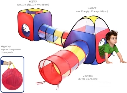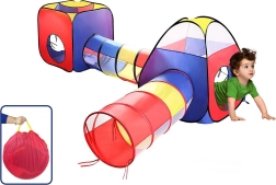 Ta komplet vključuje dva kockasta šotora in tunele v živih barvah – rdeči, modri in rumeni, ki ustvarjajo veselo in spodbudno okolje.