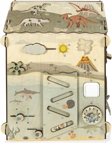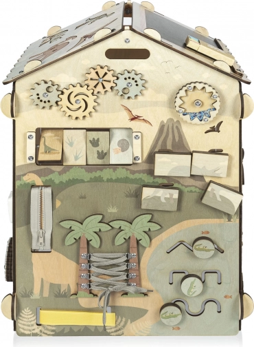 Streha služi kot črna tabla za kredo, 3D dinozavrske sestavljanke podpirajo prostorsko predstavljanje, vrtljive ploščice s stopinjami pa vodijo otroke k pozornosti in logičnemu razmišljanju. Praktični elementi, kot so zadrge, vezalke, zobniki in labirinti, pomagajo razvijati samostojnost.