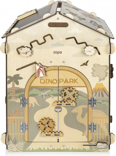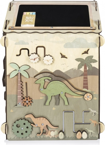 Odkrijte prazgodovinski svet poln zabave in učenja – velika lesena aktivnostna hiška z motivom Dino parka razvija fino motoriko, logično razmišljanje in kreativnost. Otroke čakajo svetleči vulkan, mehansko stikalo, 3D dinozavrska sestavljanka, vrtljive slike, labirinti, zadrge in vezanje. Del kompleta je tudi risalna tabla za kredo in varna izdelava iz kakovostnega lesa.