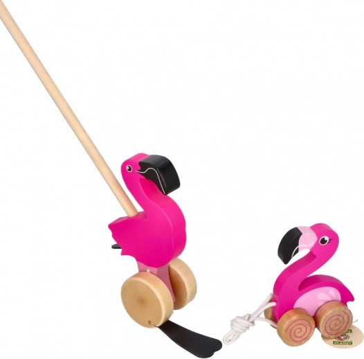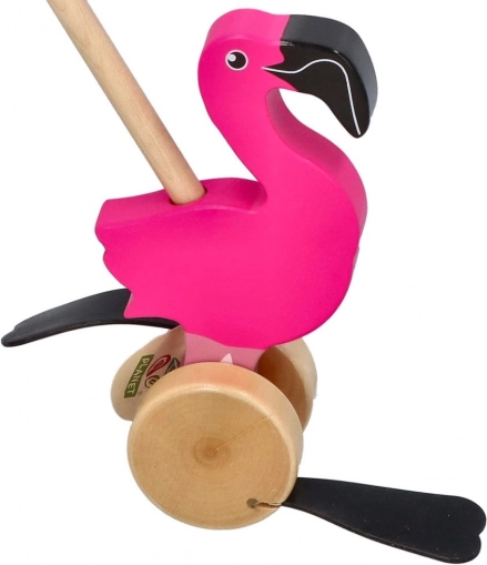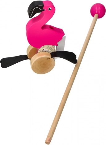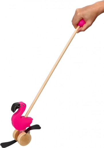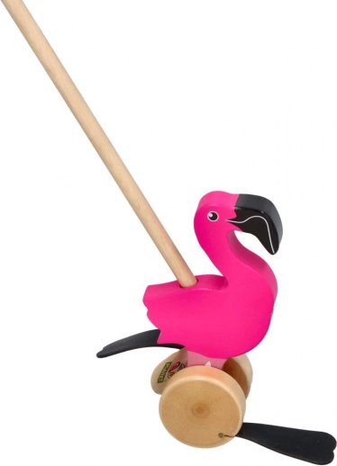 Prisrčen lesen potiskač v obliki rožnate flaminge bo razveselil vsakega malega raziskovalca. Med vožnjo se mu veselo premikajo nožice/krilca, kar otroke motivira k hoji in razvija njihovo koordinacijo. Igračo iz kakovostnega lesa z udobno palico boste cenili zaradi njene vzdržljivosti, varne izvedbe in zabavnega gibanja, ki podpira motoriko in ravnotežje.