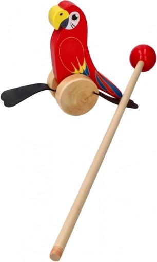Prisrčen leseni papagaj na palici je idealen spremljevalec za prve korake otrok od 18 mesecev. Ob potiskanju se kolesa gladko kotálijo, krilca pa se gibajo, kar spodbuja naravno gibanje in igrivo motivacijo za hojo. Igrača je iz trpežnega lesa, ima udobno palico dolžine 47 cm in kompaktne mere 15,5 × 10,5 × 6,5 cm. Izpolnjuje standarde CE ter ponuja stabilno vožnjo, barvit dizajn in varno izdelavo.