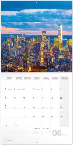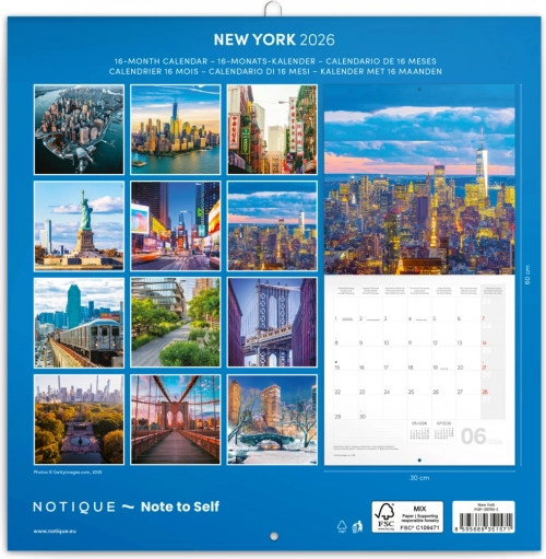 Uživajte v letu 2026 s tem osupljivim beležnim koledarjem z motivom New Yorka. Vsebuje dvanajst vrhunskih fotografij mesta in je opremljen s šestjezičnim koledarjem, ki ponuja pregled luninih men in pomembnih praznikov.