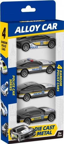 Policijski avto na vzmetni pogon, pakiranje 4 kosov, podrobna izdelava, 8 različic, dimenzije 7,3×1,7×2,5 cm.