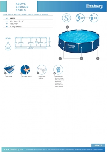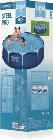 Vrtni bazen Bestway s premerom 306 cm in višino 76 cm je idealna izbira za vroče dni. Konstrukcija bazena omogoča polnitev do 90 % z vodo, kar pomeni, da sprejme 4678 litrov vode. Izdelan je iz vzdržljivega trislojnega PVC, odpornega na klor in sončno sevanje.