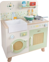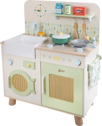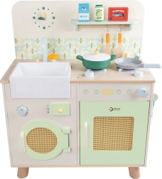 Ta lesena kuhinja je zasnovana za otroke od 3 let dalje in ponuja odlične estetske detajle v pastelnih barvah. Razvija domišljijo, motoriko in socialne veščine otrok. Izdelana je kakovostno in z veliko skrbnostjo do vsake podrobnosti. Del pakiranja so tudi kuhinjski dodatki, ki jih lahko otroci uporabijo za igro kuhanja in druge vsakodnevne situacije.