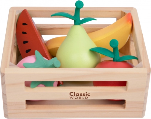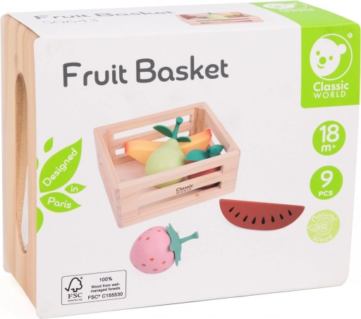Lesena košara s sadjem znamke Classic World je idealna za otroke, ki imajo radi ustvarjalno igro kuharja ali trgovine. Leseni elementi, ki predstavljajo različne vrste sadja, spodbujajo igro vlog ter razvijajo domišljijo in socialne veščine.