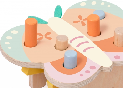 Odkrijte čar aktivne igre z leseno mizico v obliki metulja. Ta igrača spodbuja razvoj motoričnih spretnosti ter koordinacijo roka-oko s pastelnimi barvami in zabavnimi zvoki.