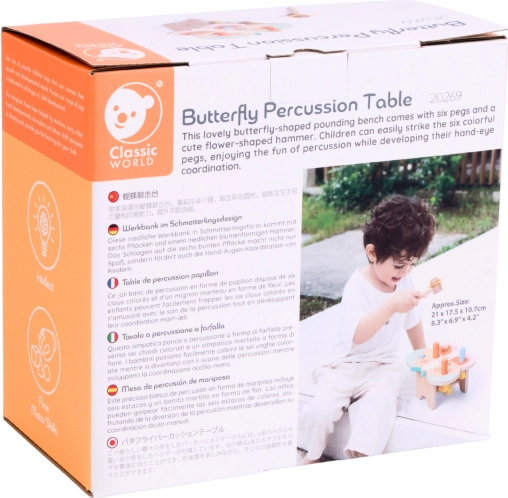 Lesena mizica v obliki metulja je idealna za otroško igro, ki spodbuja udarjanje in odkrivanje zvokov. Ta barvit in privlačen način igre podpira razvoj motoričnih spretnosti ter koordinacijo roka-oko. Set vključuje kladivce v obliki cvetlice, ki doda čar in otroke spodbuja k aktivni igri.