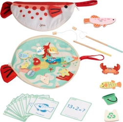 - 2 magnetni palici, lesene ribice in predmeti za lovljenje, izobraževalne karte, podloga v obliki ribe / etui
