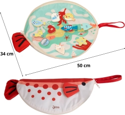 Igralna podloga v obliki ribe se po igri zlahka zloži v etui z zadrgo, kamor spravite vse komponente. Kakovita lesena izdelava in varni materiali zagotavljajo dolgo življenjsko dobo ter odpornost pri vsakodnevni uporabi.