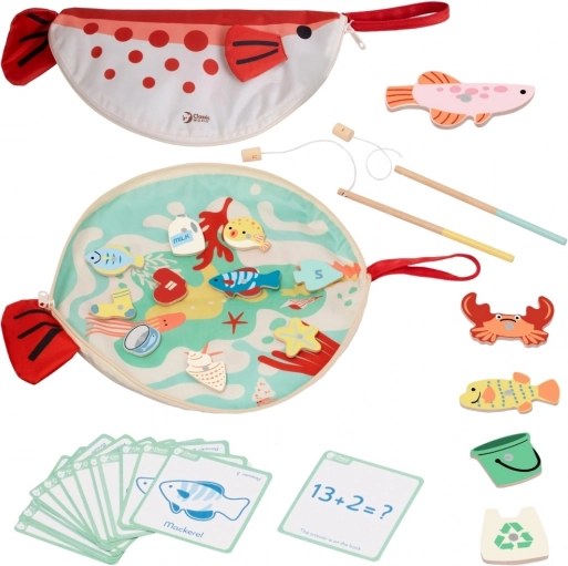 Ta leseni set ponuja 35 barvnih elementov za “ulov” s pomočjo magnetnih palic. Otroci vadijo potrpežljivost in natančnost, hkrati pa se na zabaven način učijo prepoznavati morske živali in razvrščati predmete. Izobraževalne karte prinašajo preproste matematične naloge in besedišče, zato igra naravno združuje zabavo z učenjem.