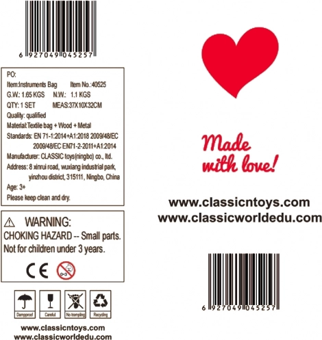 Zabaven set znamke Classic World je odlična izbira za razvoj glasbenih veščin otrok že od treh let. Poleg tega so vsi deli izdelani iz lesa in prebarvani z netoksičnimi barvami.