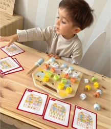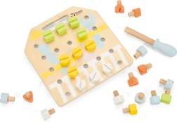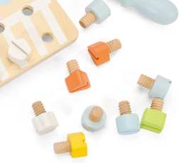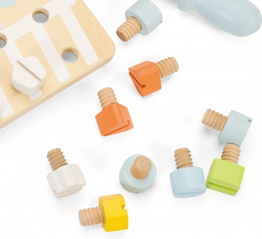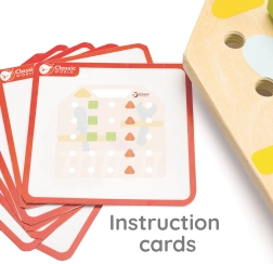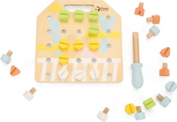 Otroci lahko na leseni plošči z vijaki ustvarjajo različne oblike, kar je zelo zabavno in hkrati koristno za njihov razvoj. Izboljšuje koordinacijo, koncentracijo ter moč zapestja in rok. Kartice s predlogami ponujajo različne izzive, ki jih lahko otroci preizkusijo, skupaj s starši pa lahko poskušajo vzorce zgraditi na pamet. Ta dejavnost prav tako prispeva k prepoznavanju barv in oblik.