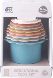 Stolp za zlaganje lončkov Cvet bo s svojimi izrazitimi barvami in možnostjo ustvarjanja različnih konstrukcij razveselil vsakega otroka. Komplet vsebuje 8 lončkov za zlaganje, ki razvijajo motorične spretnosti.