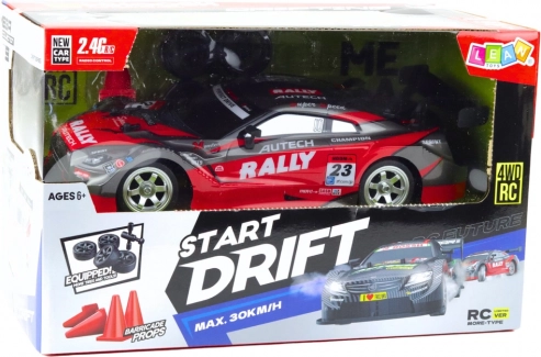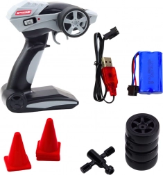 LED osvetlitev, vključno s sprednjimi, zadnjimi in podvozjnimi lučmi, poskrbi za pristnost in slog. Daljinsko upravljanje s frekvenco 2,4 GHz zagotavlja domet do 25 metrov z takojšnjim odzivom. Dodatni komplet pnevmatik in stožcev za drift vam omogoča, da si ustvarite lastno dirkalno stezo.