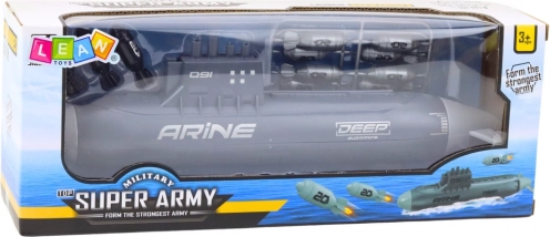 Realistidna podmornica z doleino 28 cm je idealna igradda za male ljubitelje vojaških dogodivščin in pomorskih odprav. Zahvaljujod trenjskemu pogonu se lahko premika po površini, funkcija izstreljevanja torpedov pa doda naznemirjenju in naredi igro dhejnejšo.