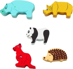 Komplet vsebuje ročno poslikane, lesene figurice, ki predstavljajo eksotične in gozdne živali, kot so slon, panda, kenguru ali jež. Vsi elementi so izdelani iz naravnega lesa in pobarvani z netoksičnimi barvami, s čimer zagotavljajo varno igro tudi za najmlajše. Gladko brušeni robovi zmanjšujejo tveganje trsk in poškodb.