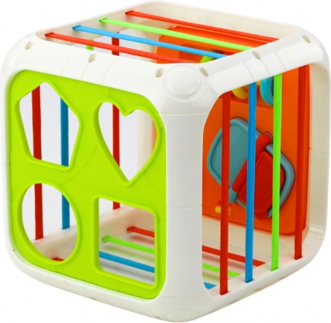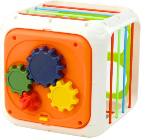 Kocka za čutno učenje ponuja različne funkcije na vsaki svoji strani, kar naredi igro raznoliko in privlačno. Vsebuje barvne oblike za razvrščanje, ki pomagajo otrokom prepoznavati barve in oblike ter izboljšujejo koncentracijo. Prav tako je opremljena z premičnimi biseri, Zobniki za vrtenje in prožnimi palicami, skozi katere lahko potiskate predmete, kar spodbuja čutenje in vabi k odkrivanju.