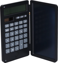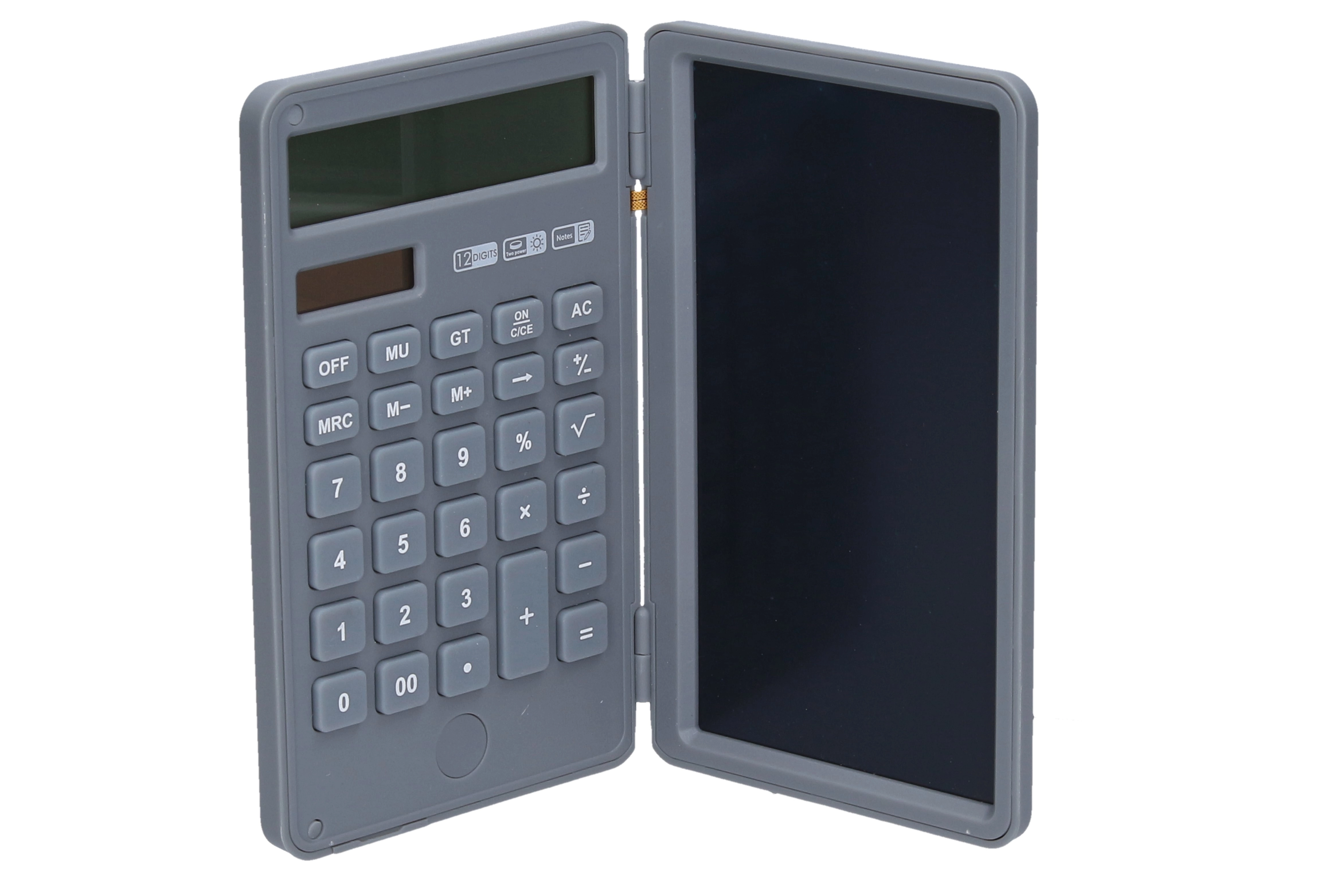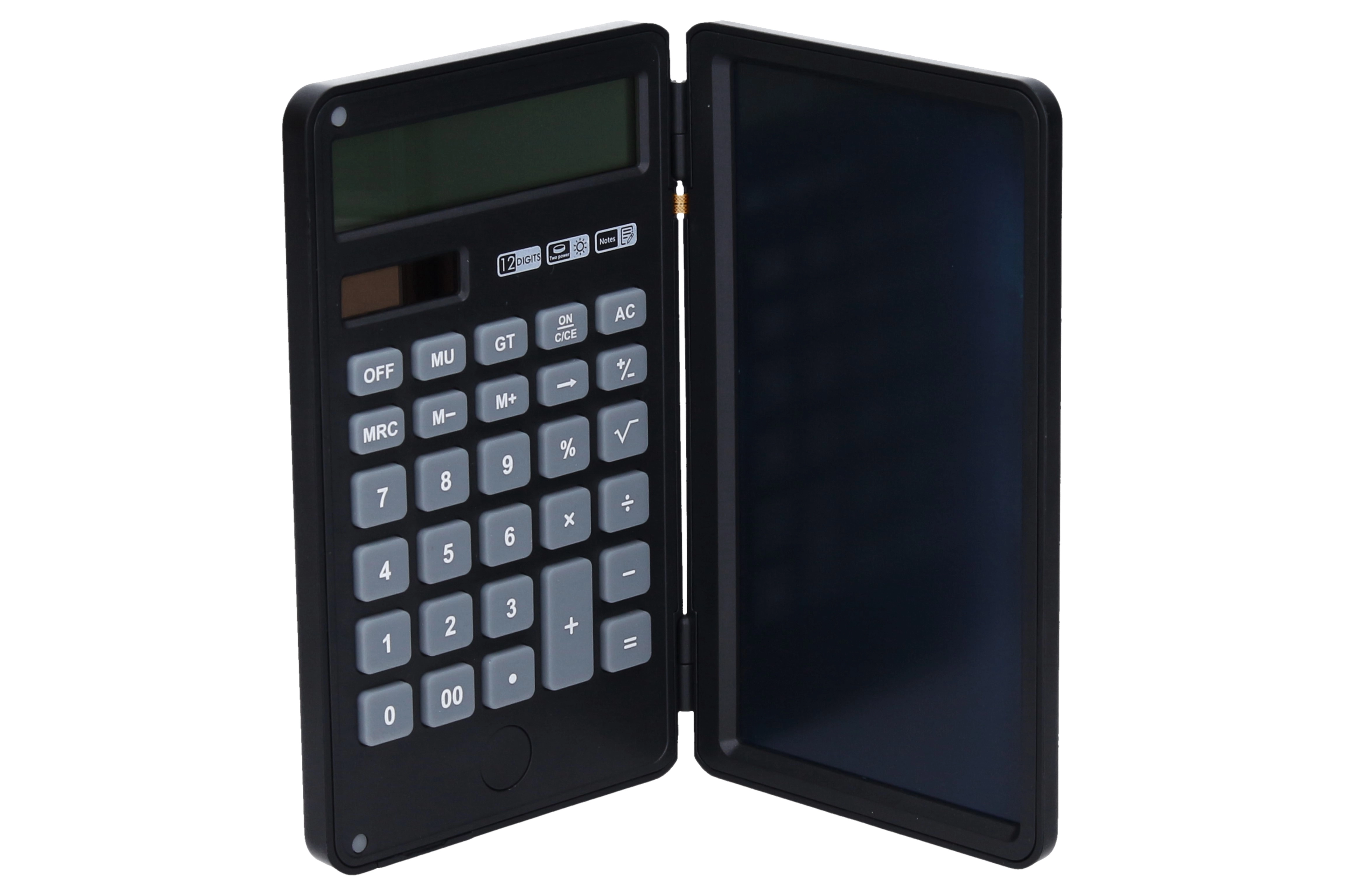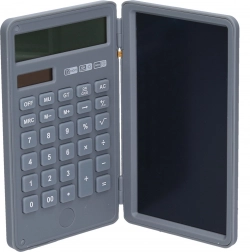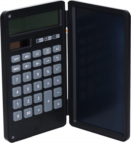 V povsem odprtem stanju kalkulator doseže mere 18 x 15 cm, kar zagotavlja udobno uporabo. Na voljo sta dve elegantni barvni različici: črna in siva.