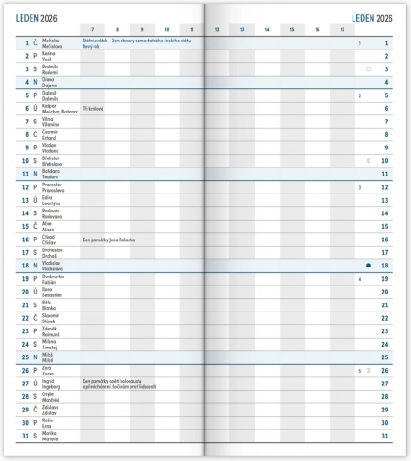 Dnevnik Notique ponuja udoben in pregleden način za načrtovanje dni in mesecev. Zahvaljujoč češkemu koledarju vključno z imeniki in prazniki boste imeli vse pomembne informacije vedno pri roki. Vsebuje tudi: