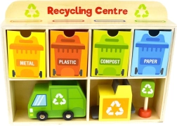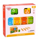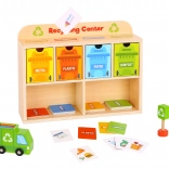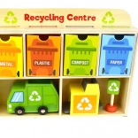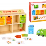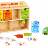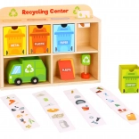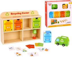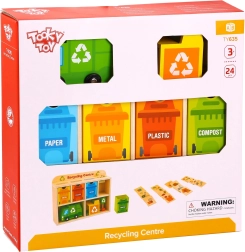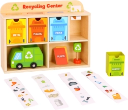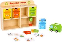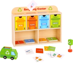 Z Reciklačnim Centrom Tooky Toy se bodo otroci naučili pravilno ločevati odpadke. Vsaka kartica prikazuje odpadek iz različnih materialov, ki ga otroci najprej vložijo v smetarsko vozilo, nato v razvrščevalnik in na koncu v ustrezen kontejner, nameščen v lesenem omarici.