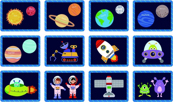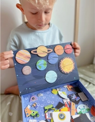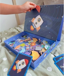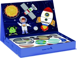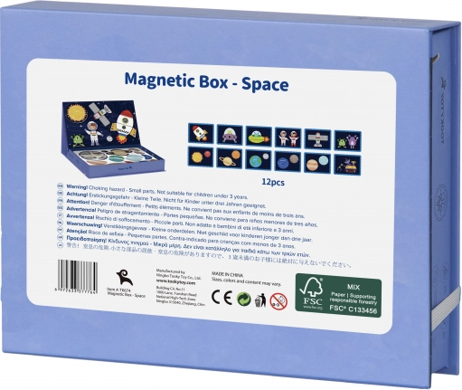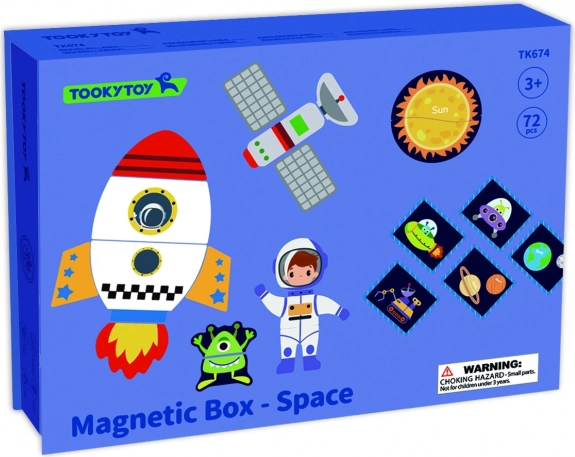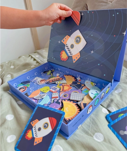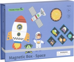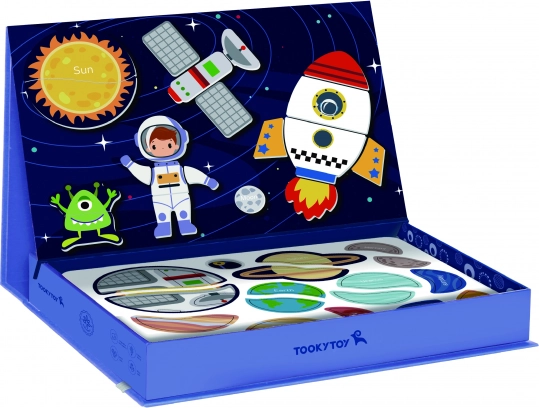 Magnetna sestavljanka TOOKY TOY je privlačna izobraževalna igrača, ki otroke vodi skozi neskončne vesoljske svetove. Set vsebuje 12 različnih vesoljskih vzorcev, vsak razdeljen na štiri do pet magnetnih kosov. Zahvaljujoč magnetnim nalepkam lahko otroci preprosto ustvarjajo svoje vesoljske prizore na priloženi magnetni tabli.