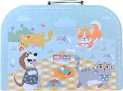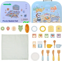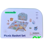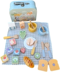 Leseni piknik set TOOKY TOY v ljubkem turkiznem kovčku prinaša otrokom realistično zabavo pri pripravi in serviranju hrane. Pisano sadje in pecivo je mogoče »rezati« in ponovno sestavljati, ne manjkajo krožnički, pribor, skodelice ter kartončki mleka in soka. Igra razvija fino motoriko, koordinacijo oko–roka ter jezikovne veščine skozi naravno igro vlog.