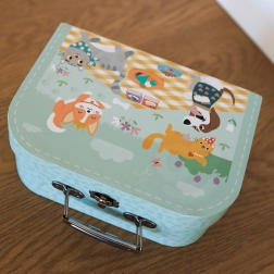 Stilski turkizni kovček z kovinskim ročajem in zapiranjem drži vse dele skupaj. Preprosto ga je nositi na izlete in obiske.
