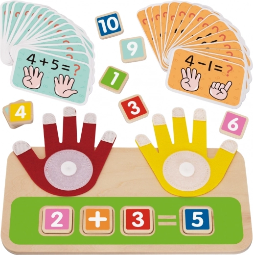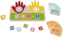 - Lesena podlaga z dvema premičnima rokama (rdečo in rumeno), ki simulirata štetje na prste