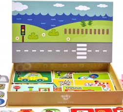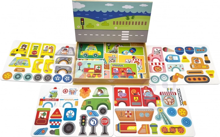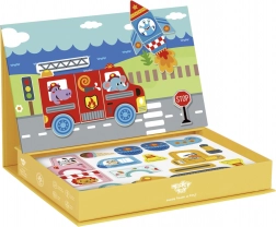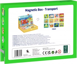 Ta magnetna sestavljanka v pametni škatli skriva izvlečno magnetno tablo kar v pokrovu. Otroci lahko s pomočjo barvitih magnetnih koščkov sestavljajo živali in druge motive na pripravljenih podlagah ali ustvarjajo lastne slike. Igra razvija kreativnost, koncentracijo in koordinacijo oko–roka.