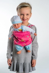 Po zaslugi nastavljivih naramnic se nosilo prilagodi otrokom različnih višin, trden kengurujski žep velikosti 29 × 20 cm pa drži večino običajnih punčk in plišastih igrač. Odličen za doma, park in obiske – igrača bo vedno pri roki.