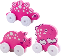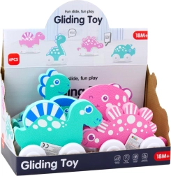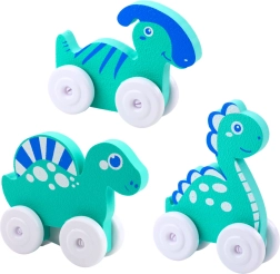 Barviti dinozavri na kolescih so zasnovani za otroško zabavo. Imajo prijazen videz, zaobljene oblike in pastelne barve, ki spodbujajo domišljijo. Zahvaljujoč kolesom se igrače zlahka premikajo, lahka konstrukcija pa omogoča, da jih otrok preprosto potiska in vzame s seboj kamorkoli.
