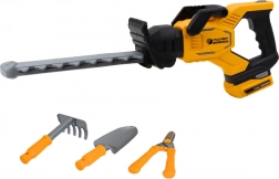 Otroški vrtnarski komplet vključuje realistično igračo električnih škarij za živo mejo z gibljivimi plastičnimi rezili. Dovolj je pritisniti gumb in lahko se začne varno »rezanje«! Škarje imajo ergonomski ročaj, snemljiv baterijski modul in elemente, ki posnemajo delovanje pravega vrtnarskega orodja. Del kompleta so tudi ročna orodja: grablje, lopatka in obrezovalnik.