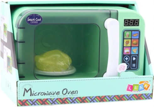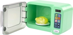 Vgrajeni zvočni učinki in osvetlitev, ki se aktivirata med uporabo, naredijo igro še bolj realistično in privlačno. V notranjosti je vrtljiv krožnik, na katerega lahko položite priloženega plastičnega piščančka. S pritiskom na enega izmed barvnih gumbov lahko otroci simulirajo segrevanje hrane, čisto tako kot pri pravem aparatu.