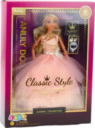 Lutka Anlily v pudrovo rožnati večerni obleki deluje posebno zahvaljujoč pahljačastemu dekorativnemu volanu in okrasnemu traku. Ima dolge blond lase, ki jih je mogoče česati in oblikovati, njeno nežno ličenje in izrazite poteze pa lutki dajejo topel in eleganten videz. Z gibljivimi udi – rokami, nogami in glavo – je lutka idealna za dinamično igro, preoblačenje in ustvarjanje vsakdanjih ter pravljičnih zgodb.