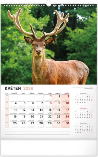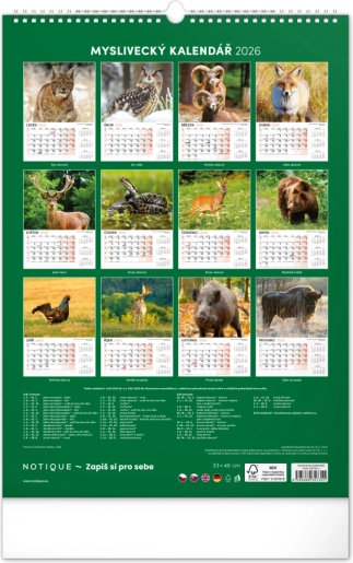 Stenski koledar za lovce, ki prinaša impresivne fotografije živali iz slovenskih gozdov, skupaj s pomembnimi informacijami za lovce, vključno z obdobji lova in časi vzhodov in zahodov sonca.