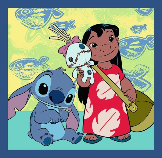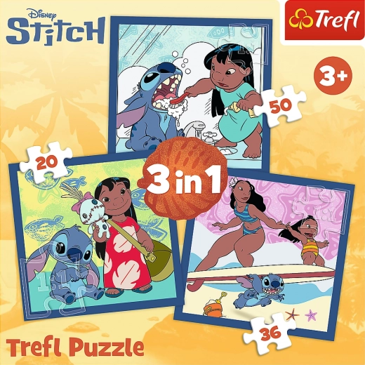 Sestavljanka 3 v 1 z motivom LILO & STITCH od Trefl. Tri samostojne sestavljanke, največja 200 × 195 mm. Okolju prijazni materiali, primerno od 3 let.