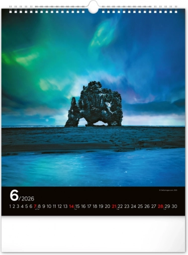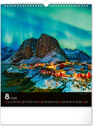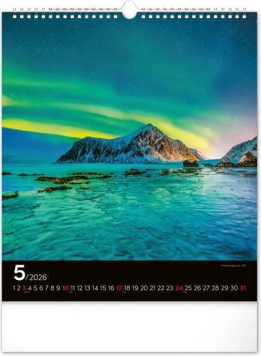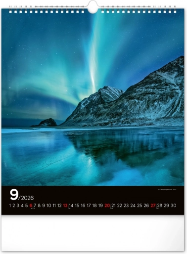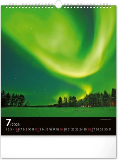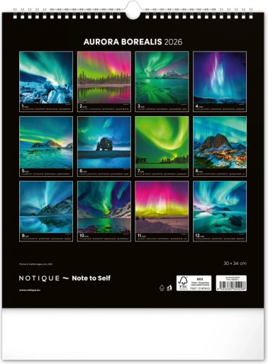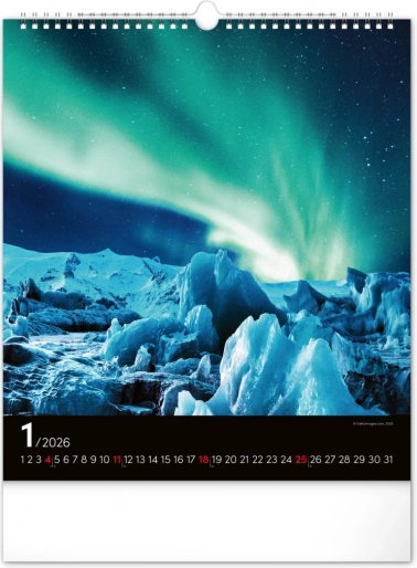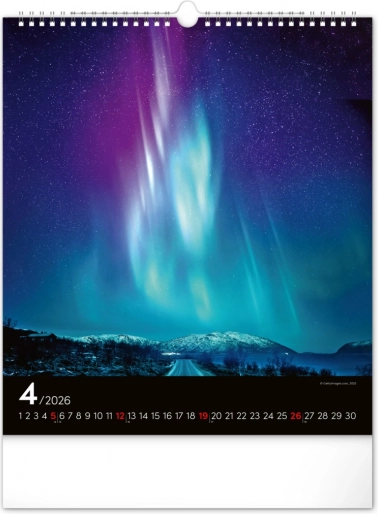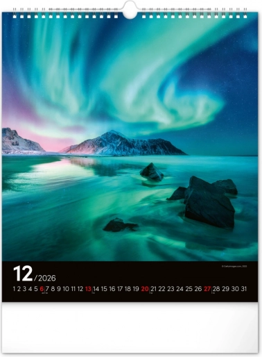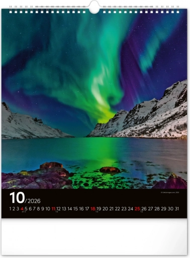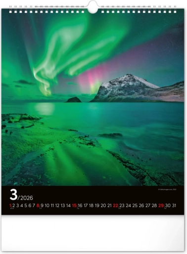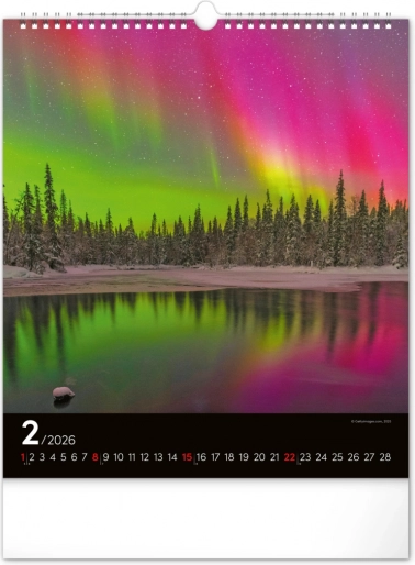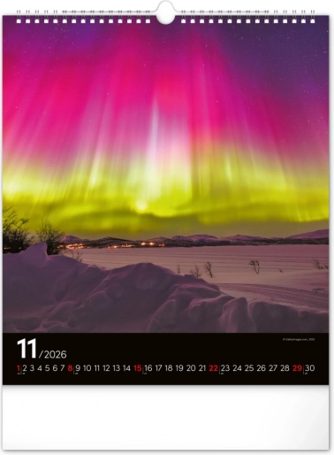 Ponesite svoja sanjarjenja v realnost in okrasite svoj prostor s čudovitimi podobami polarnih svetlob z našim stenskim koledarjem za leto 2026: