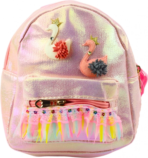 Model ima dva žepa – prostoren glavni predal in sprednji žep, oba z zapiranjem na zadrgo. Nahrbtnik sprejme vse, kar otrok potrebuje vsak dan: malico, igračo, stekleničko ali knjigo. Okrasni detajli, kot so aplikacije labodov s cvetovi in barvna peresa, ga naredijo ne le funkcionalnega, temveč tudi izrazit modni dodatek.