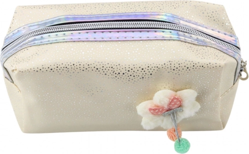 Stilna kozmetična torbica v bež barvi z mašno in bleščicami. Idealna za šolo ali vsakodnevno uporabo. Praktična s trdno zadrgo.