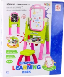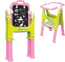Tabla je opremljena z nastavljivo višino in kotom nagiba, kar omogoča prilagoditev starosti in višini otroka. V setu najdete celoten osnovni pribor: 12 barvic, 12 barvnih kred, 4 vodne flomastre, 10 listov A4, gobico in organizator za pripomočke. Otrok lahko udobno ustvarja zahvaljujoč stabilni osnovi in trdnemu stolčku, razvija svoje ročne spretnosti in prostorsko zaznavanje.
