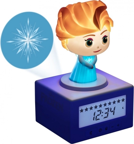 Svetleča namizna budilka z likom princese Else iz filma Frozen. Vključuje USB kabel za napajanje in projekcijo na steno za lažje uspavanje.