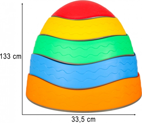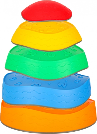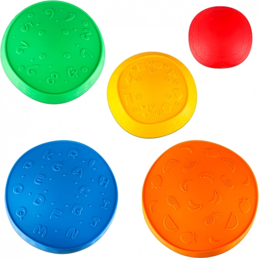 Ta set vsebuje pet različno barvnih kamnov: rdeč z ornamenti, rumen z oblikami, oranžen z motivi sadja, moder s črkami in zelen s številkami. Vsak kamen je izdelan iz trpežnega poliuretana, kar zagotavlja odpornost in dolgo življenjsko dobo.