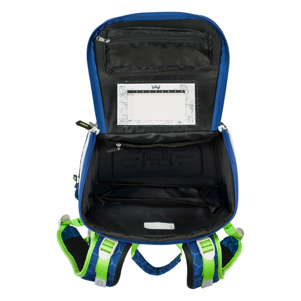 Oblikovanje aktovke je prijetno na pogled in funkcionalno. Notranji organizator ter poseben termo žep za malico pomagata ohranjati red, medtem ko zamenljivi našitki omogočajo otrokom, da po želji spreminjajo videz aktovke.