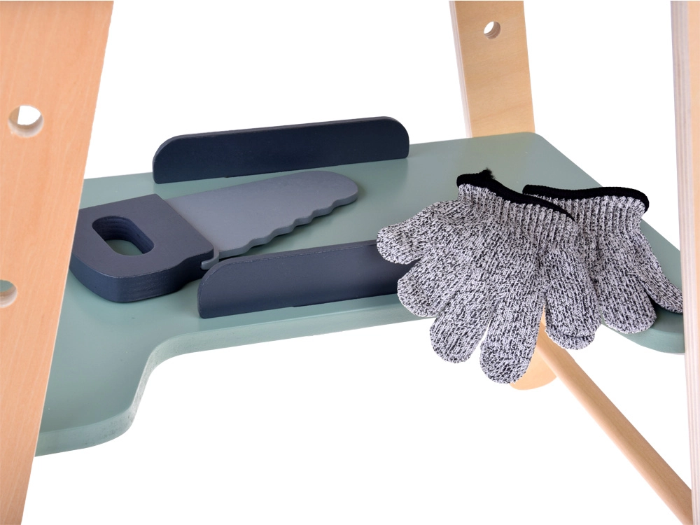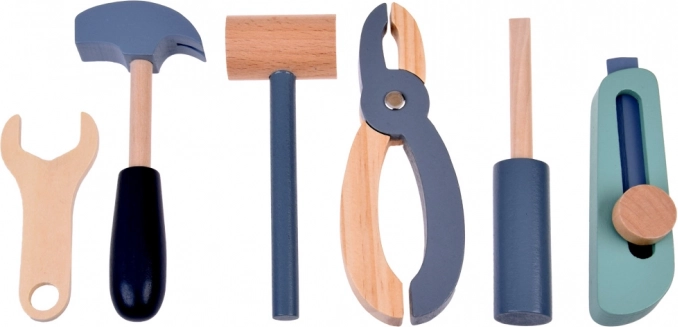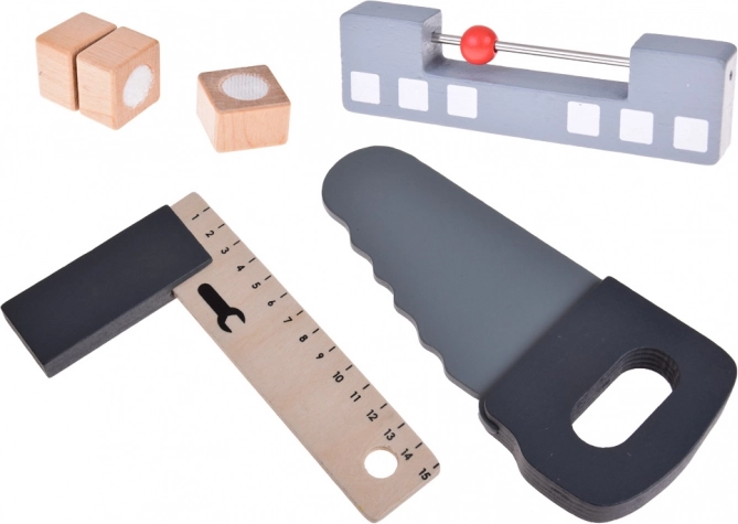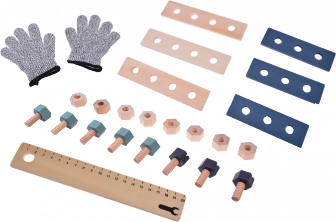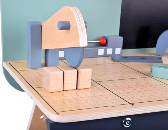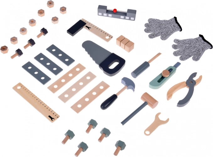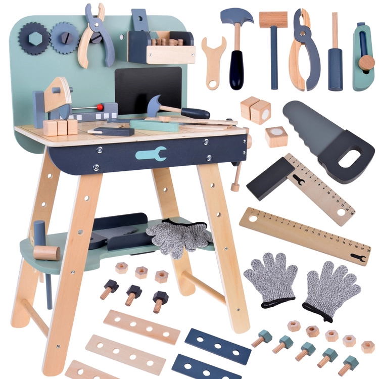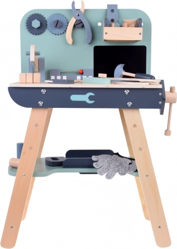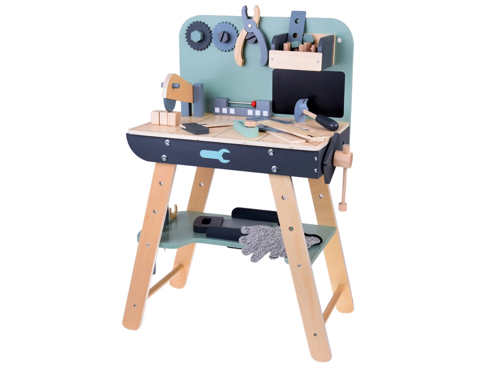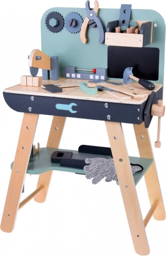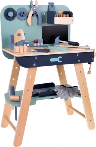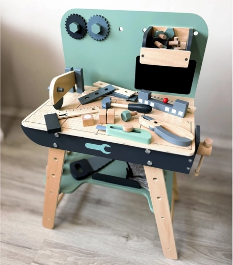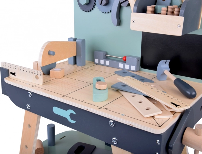 Komplet je izdelan iz trpežnega lesa in vključuje orodja, kot so kladiva, ključi, izvijači in drugo. Vsi elementi so varni, zaobljeni in izdelani z poudarkom na podrobnostih. Delovni prostor je opremljen tudi z manjšo kredno tablo za načrtovanje projektov.