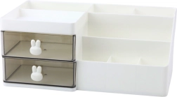Celoten organizator je izdelan iz odporne plastike, ki prenese vsakodnevno uporabo. Minimalistična zasnova in nevtralne barve se odlično podajo v vsak prostor – tako v pisarno, otroško sobo kot tudi domačo delovno sobo. Ročaji predalov v obliki zajčkov dodajo organizatorju šarm in edinstven slog.